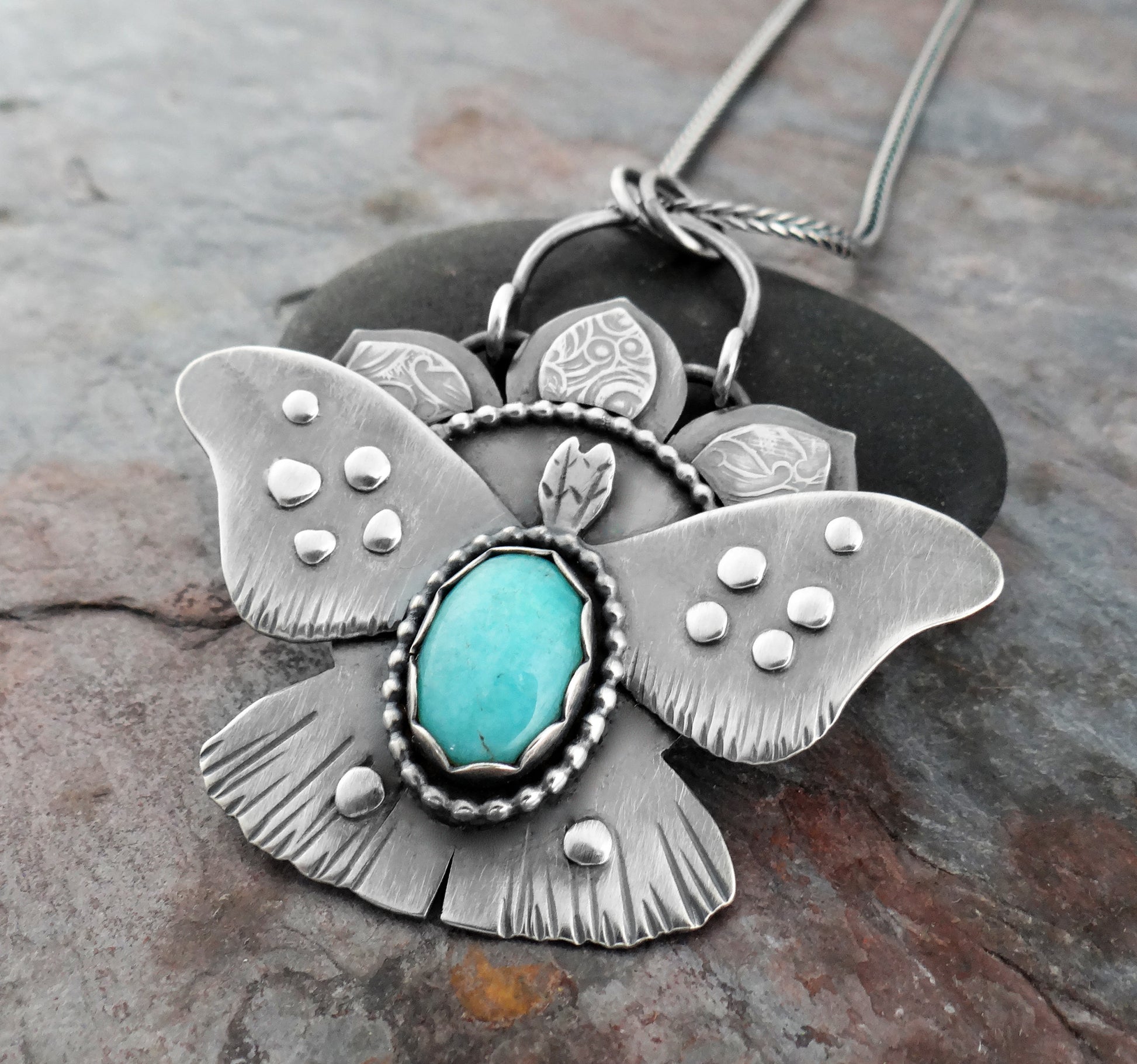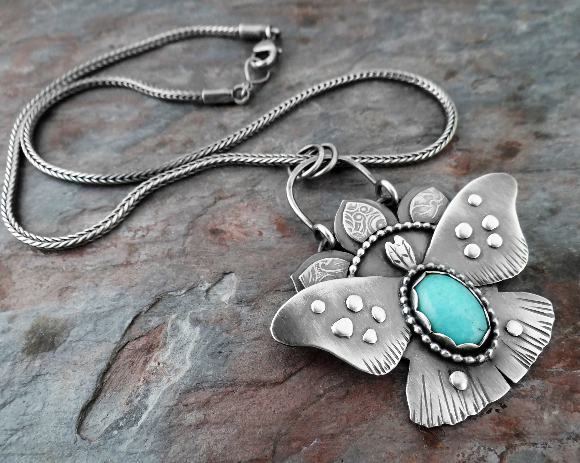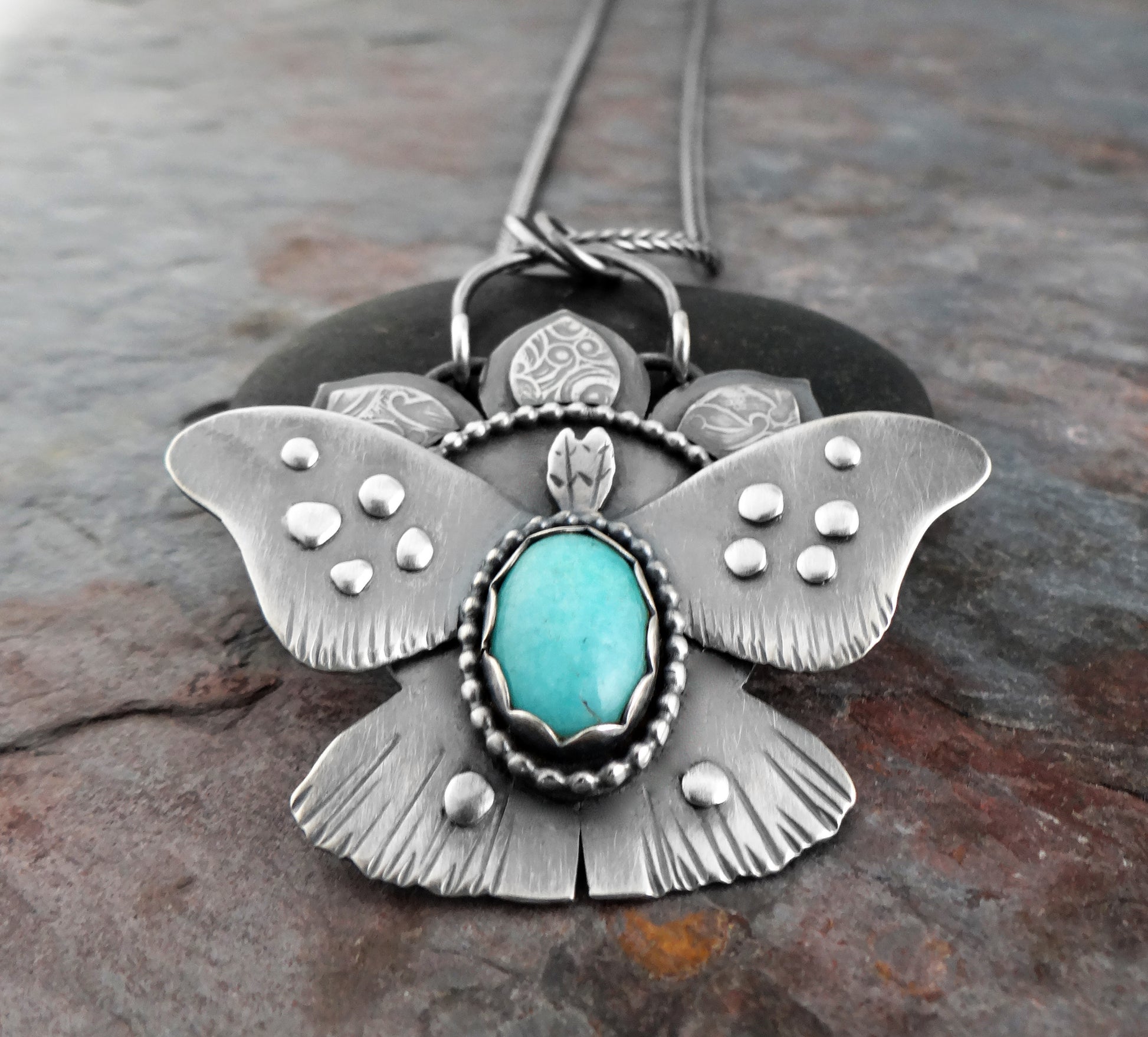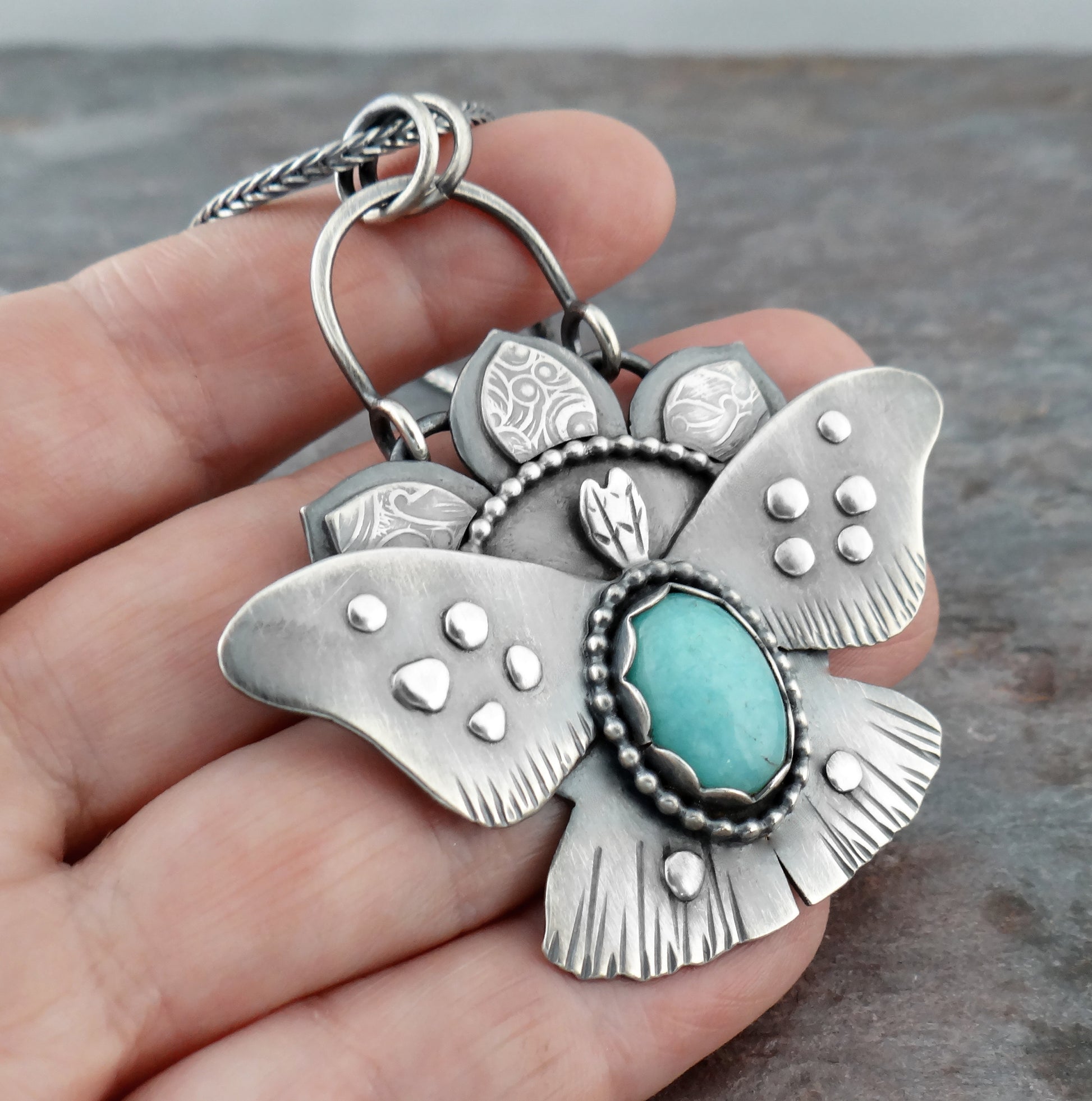 This bold moth is completely hand-fabricated from solid sterling silver. Nestled in the center is a pretty blue amazonite gemstone. The pendant is 2-1/8" wide and 2-1/4" tall on a 16" foxtail chain.