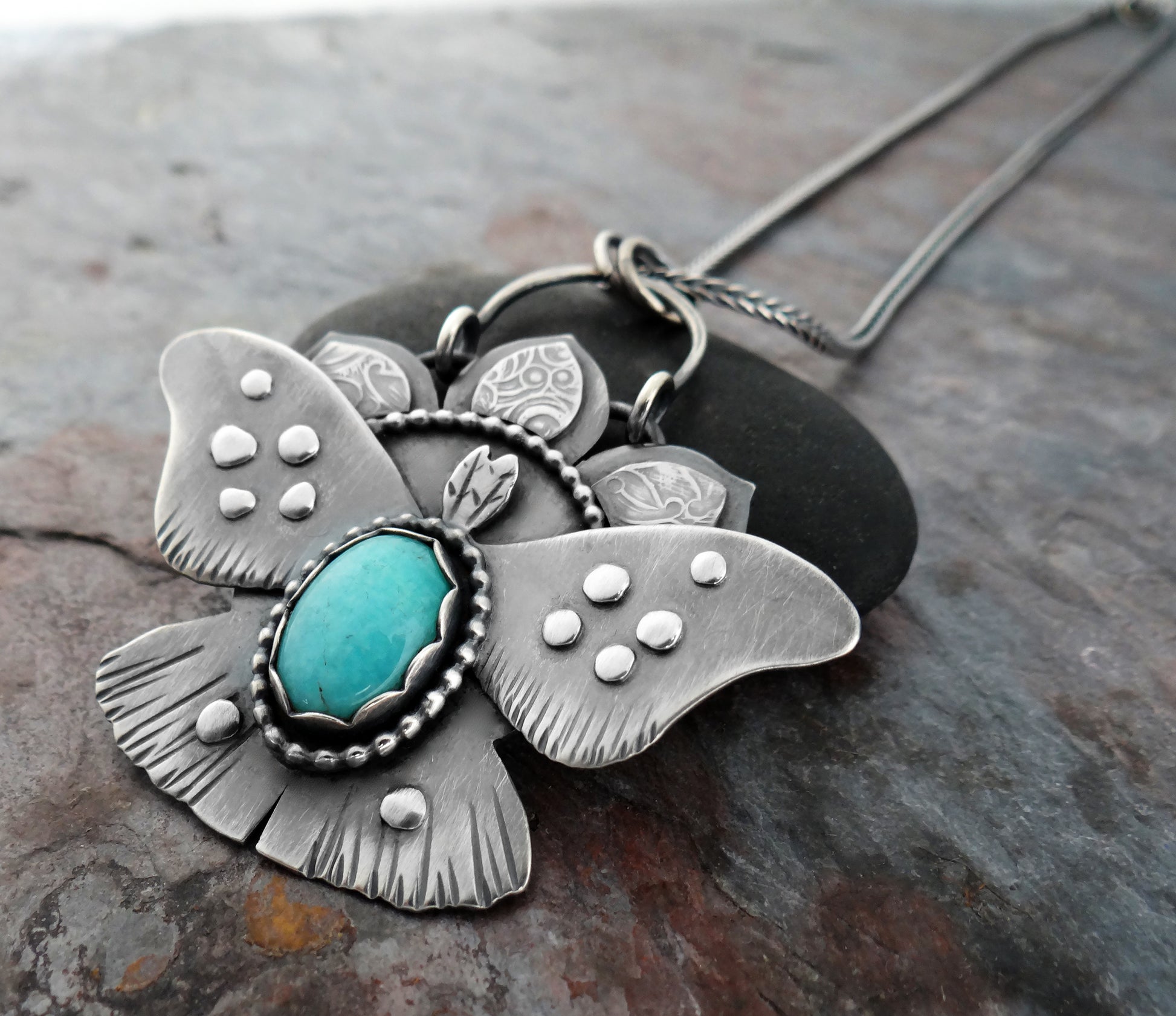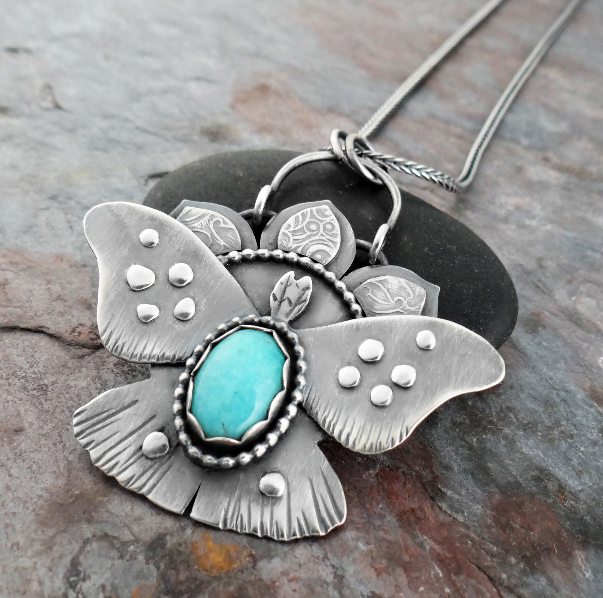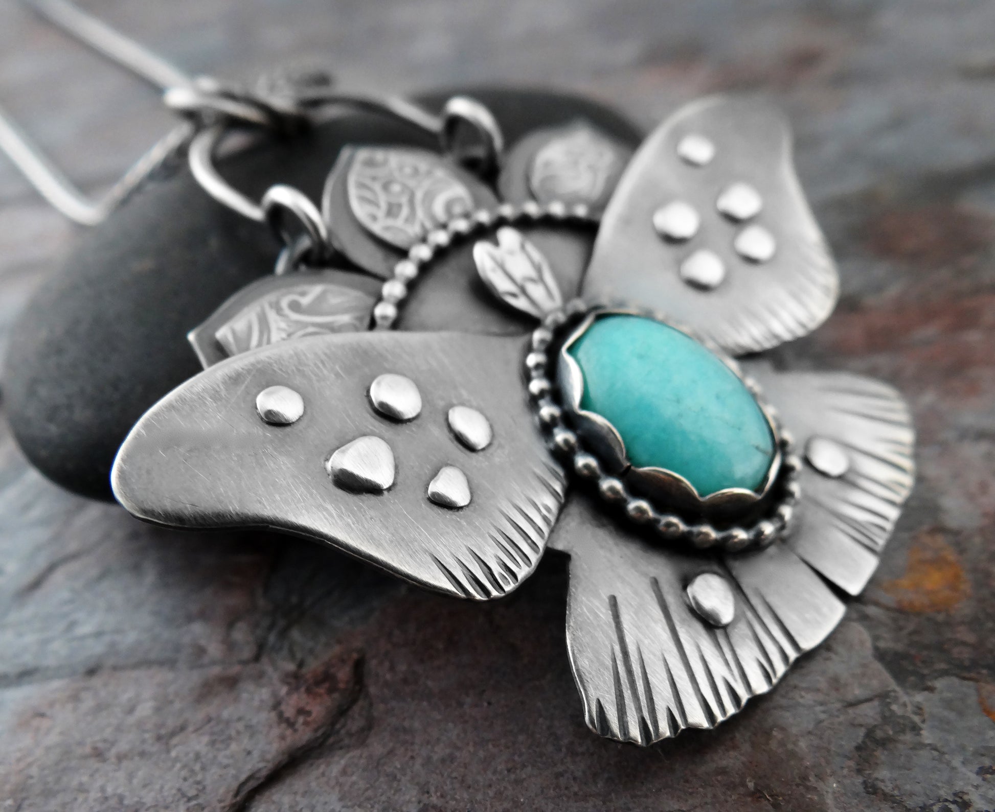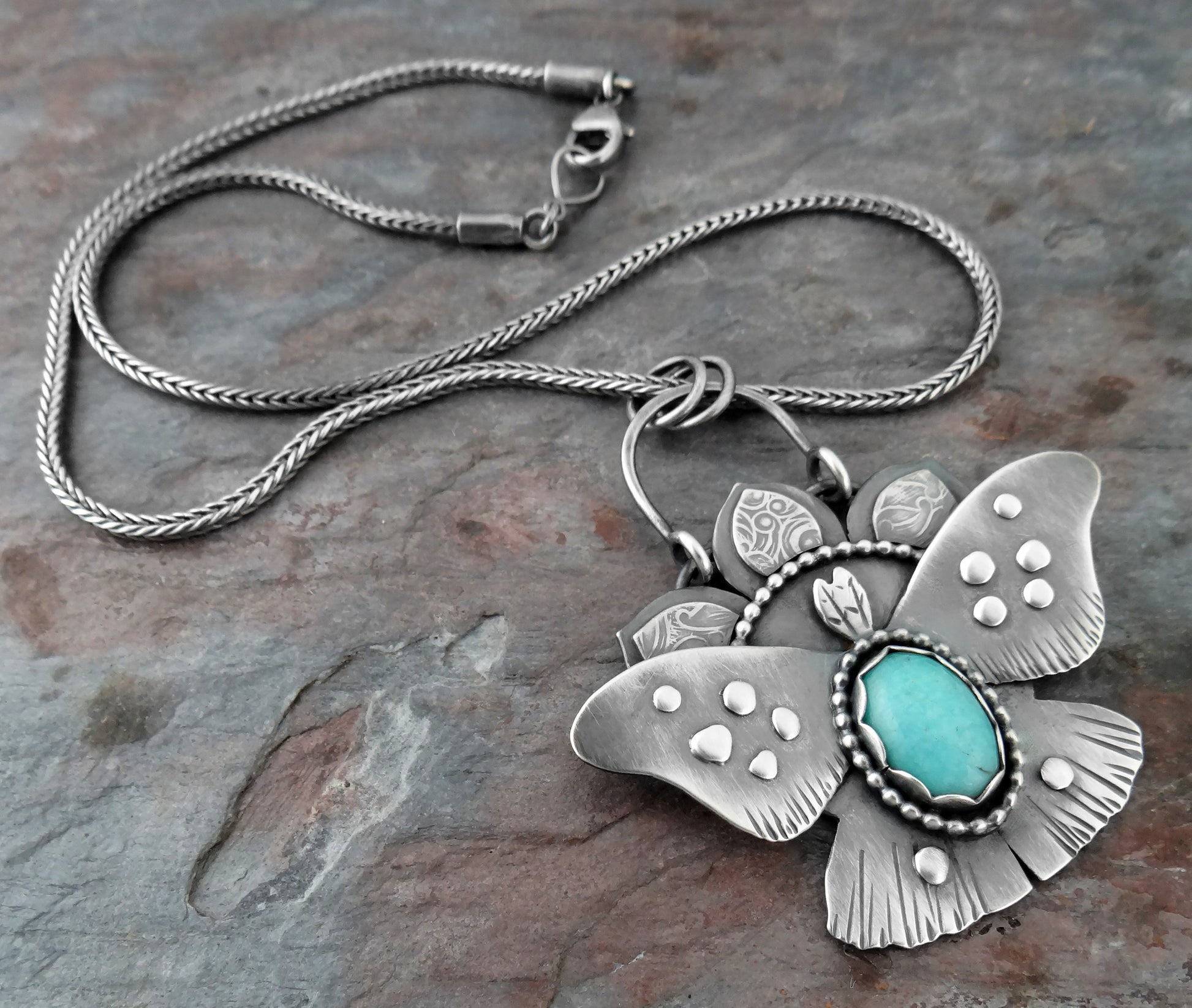 This bold moth is completely hand-fabricated from solid sterling silver. Nestled in the center is a pretty blue amazonite gemstone. The pendant is 2-1/8" wide and 2-1/4" tall on a 16" foxtail chain.