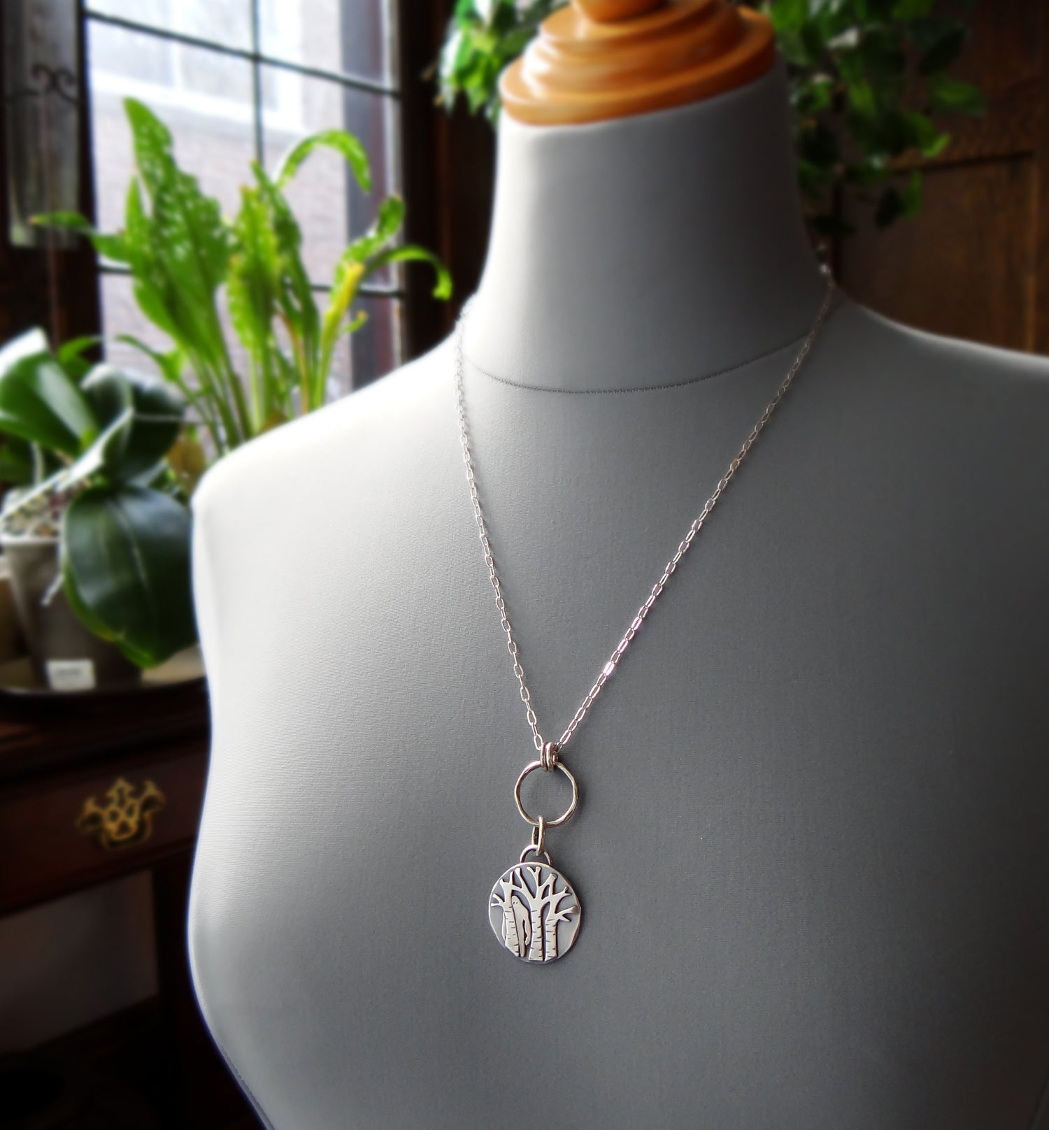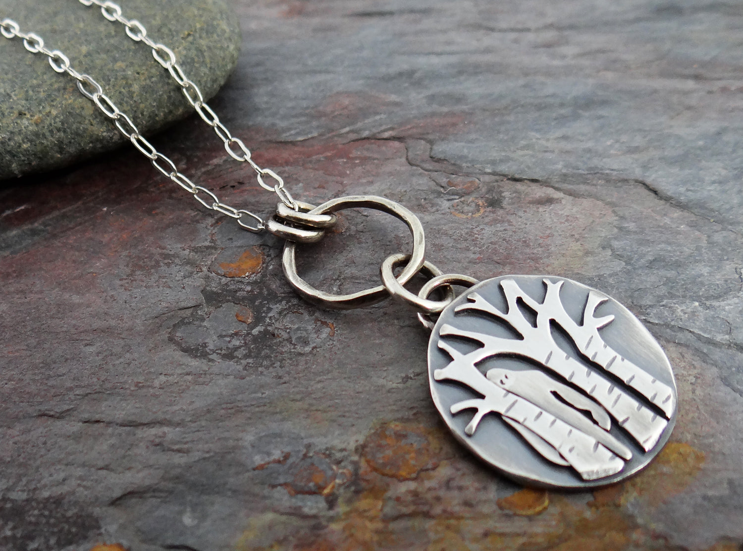 Completely hand fabricated from sterling silver, this pendant is 1 inch wide by 2 inches long and dangles on a sterling silver chain (the one pictured is on a 22-inch long chain).