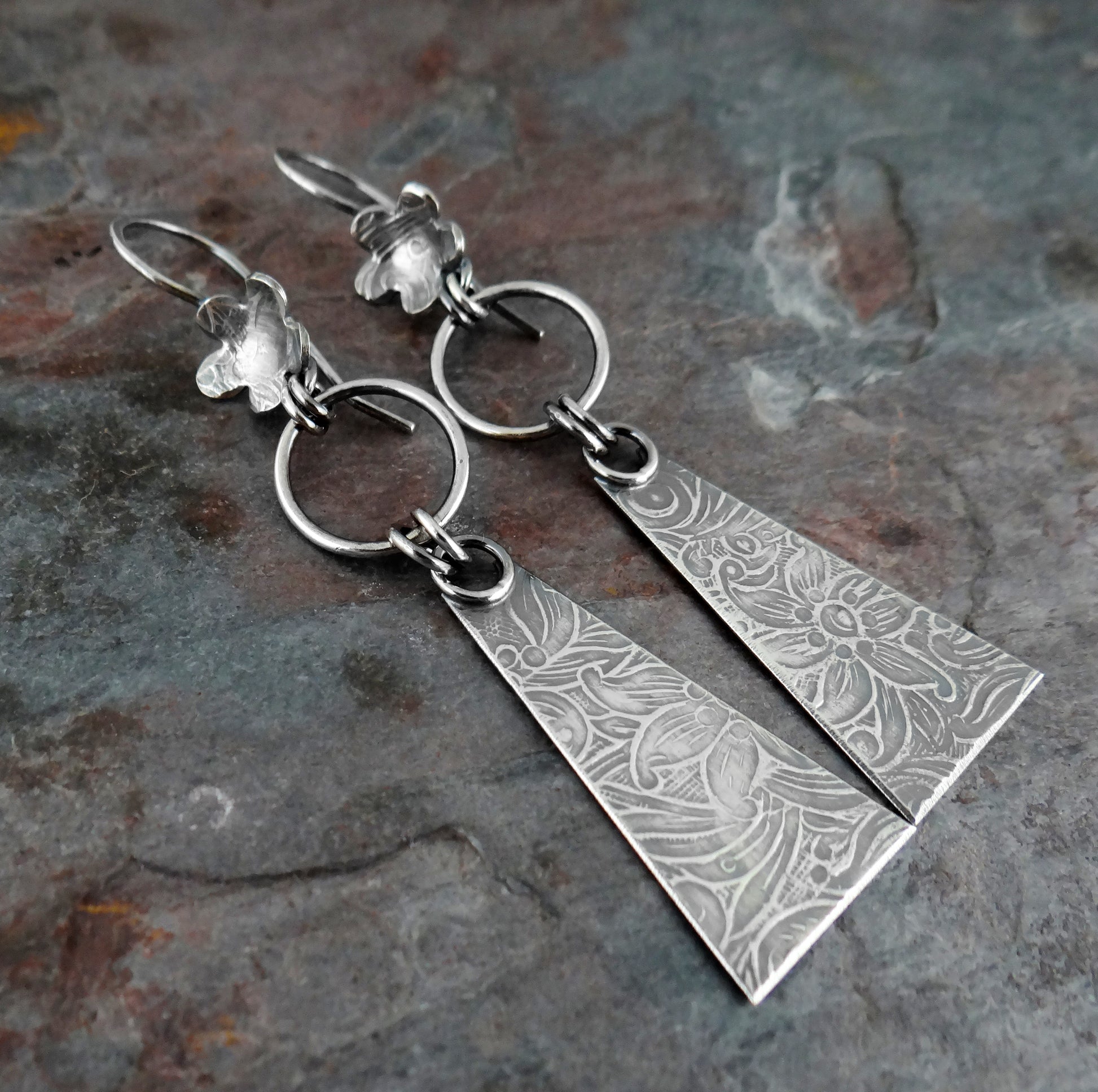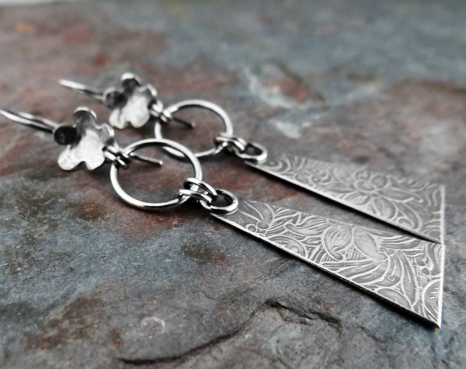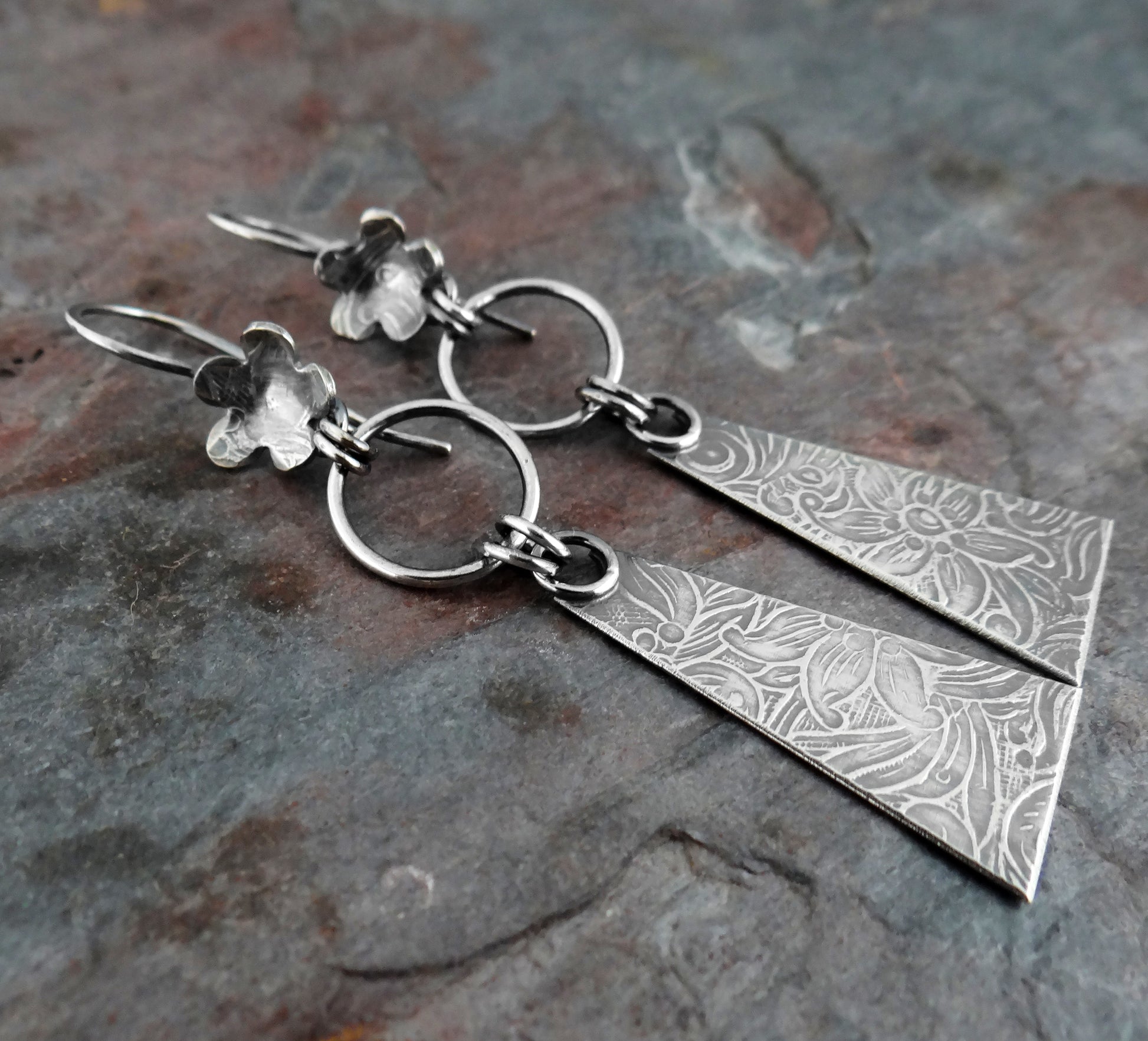 Textured geometric dangles are softened by tiny flowers. Completely hand-fabricated in my studio from solid sterling silver. The earrings are just over 2-3/8" long with an oxidized finish.