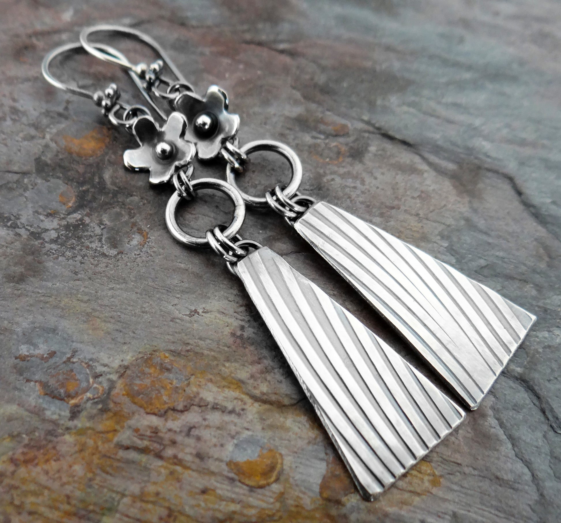 Textured geometric dangles are softened by tiny flowers. Completely hand-fabricated in my studio from solid sterling silver. The earrings are just over 2.5" long with an oxidized finish.