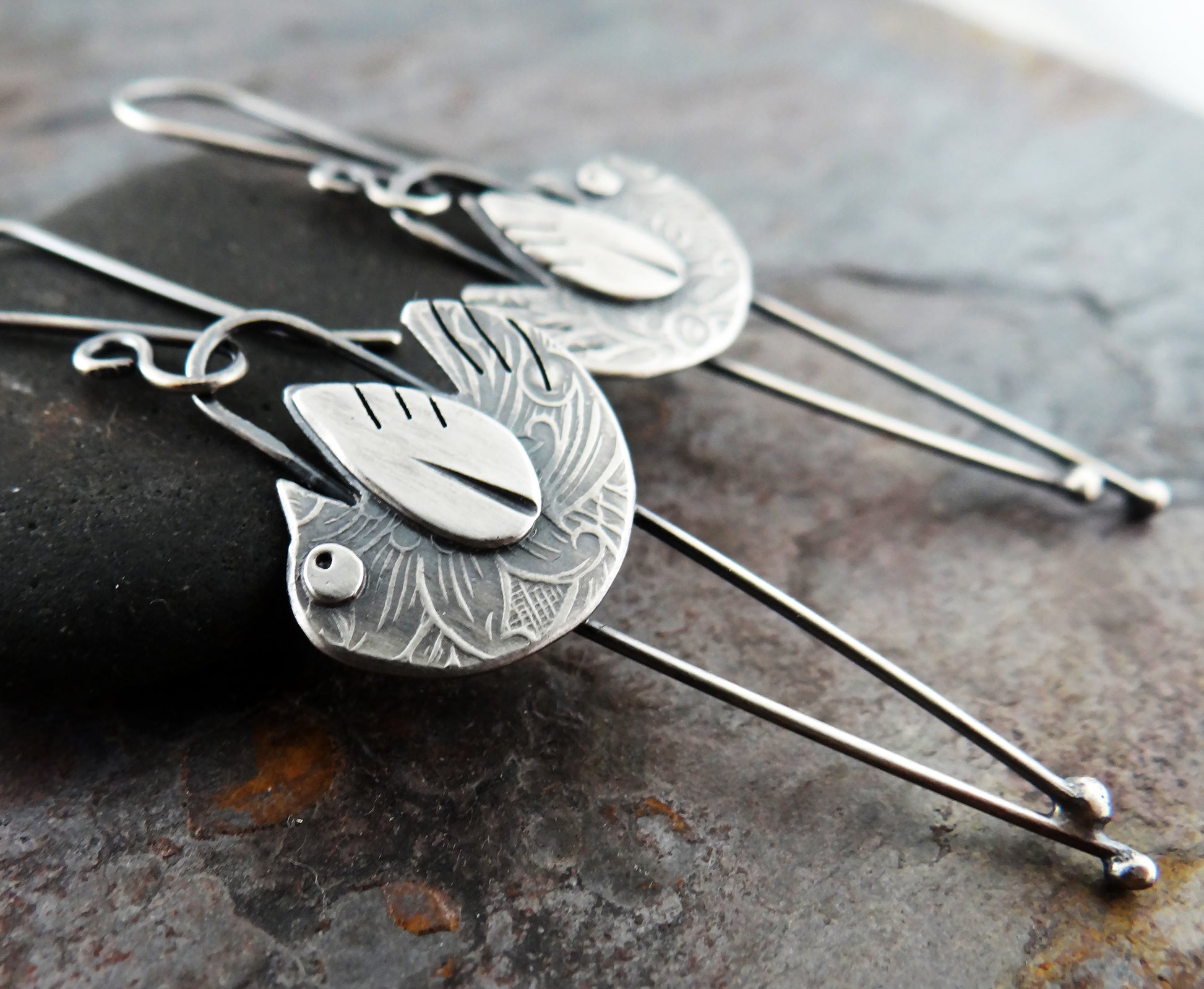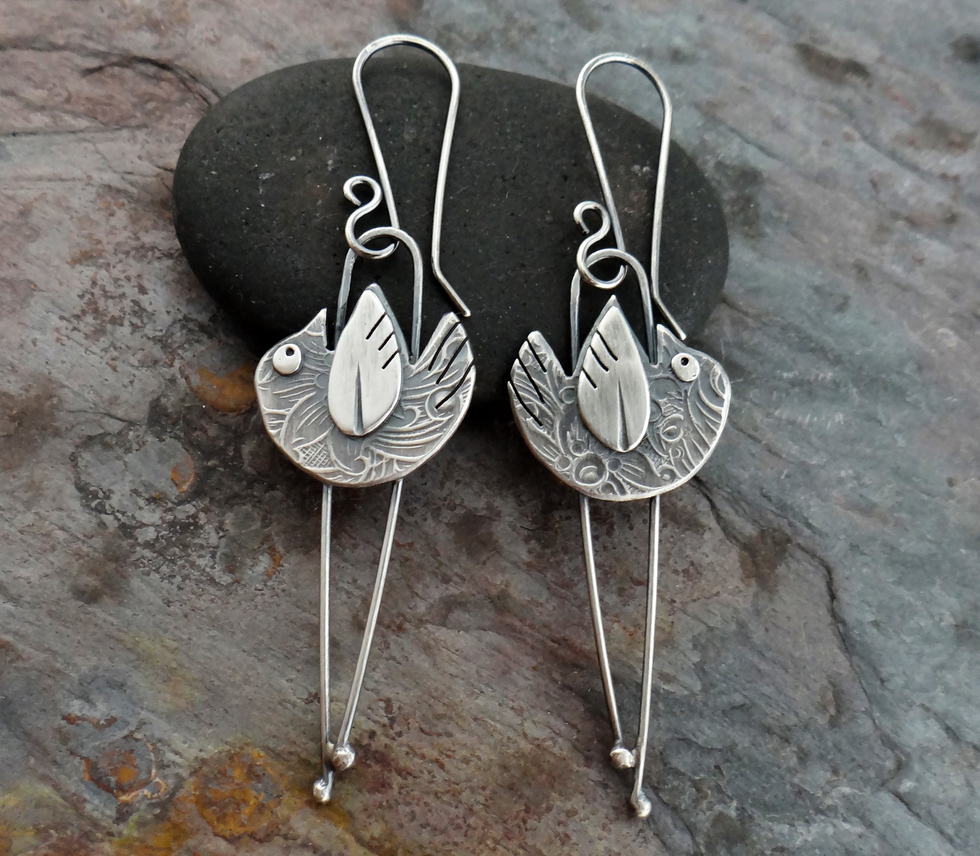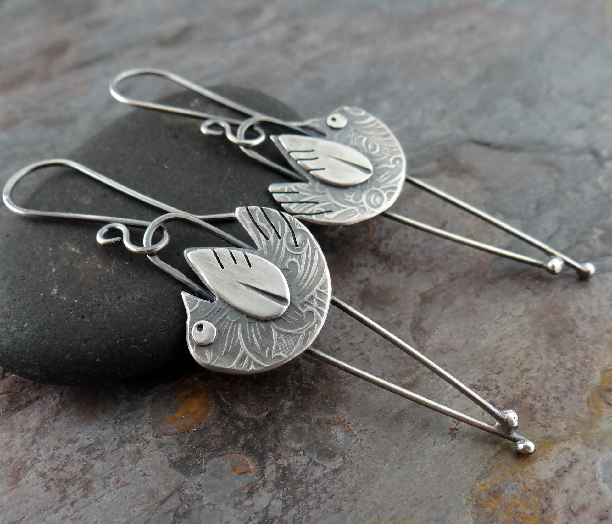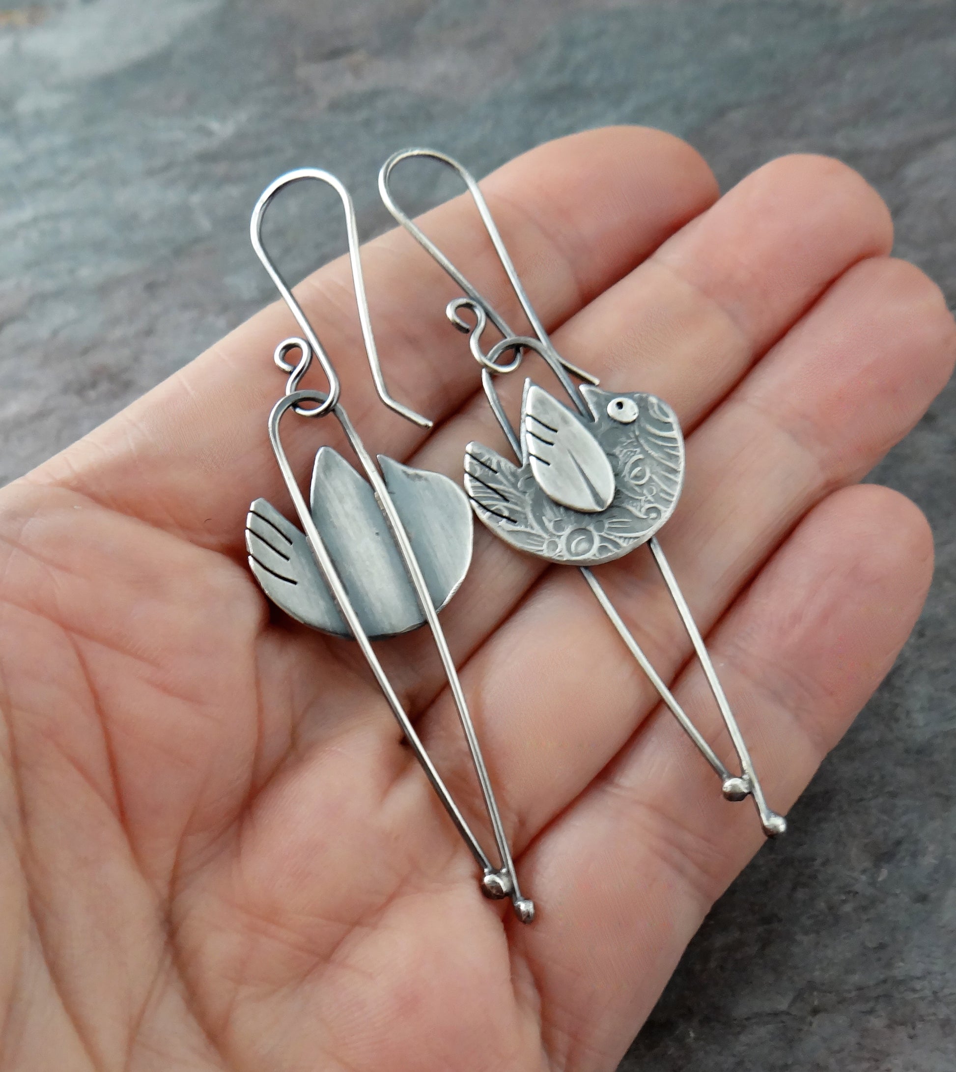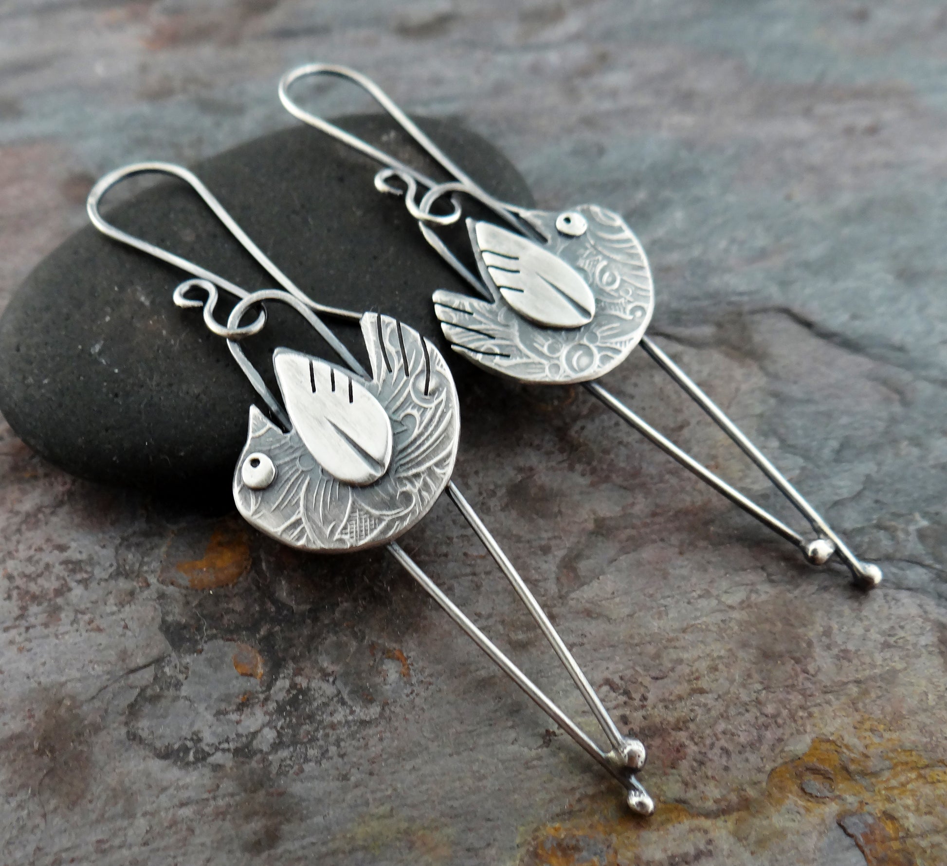 These whimsical birds began with sterling silver that I put through my rolling mill to impress a floral texture. I added wings, eyes, and playful long legs.