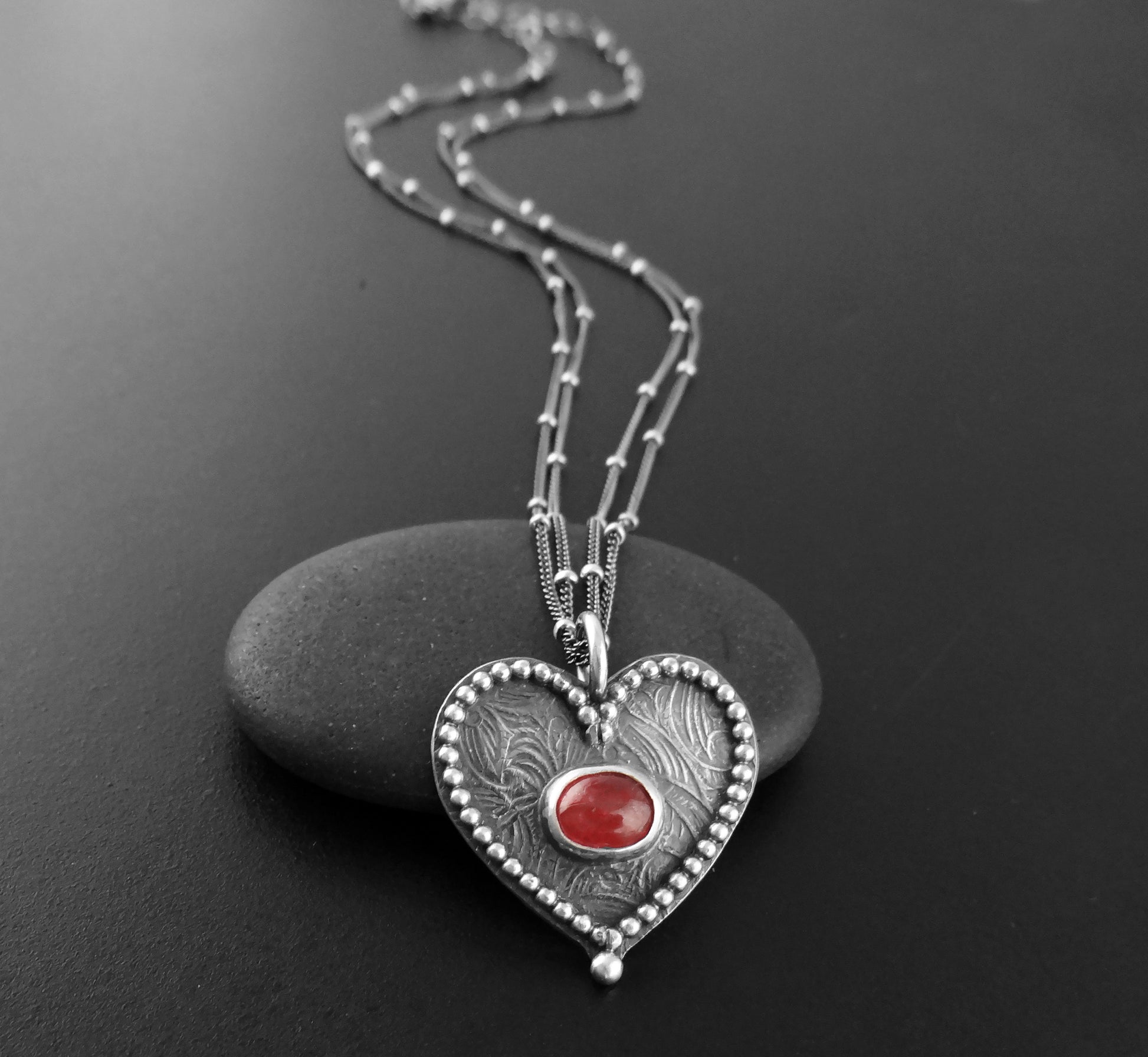 A pretty pink rhodonite cabochon is set in a floral textured heart that makes me smile. The heart dangles from double layers of delicate beaded chain with a lobster clasp. It adjusts from 15.5" to 17.75" long to easily layer with other necklaces. The pendant is completely hand-fabricated in my Wisconsin studio. Solid sterling silver. The heart is 1" tall.