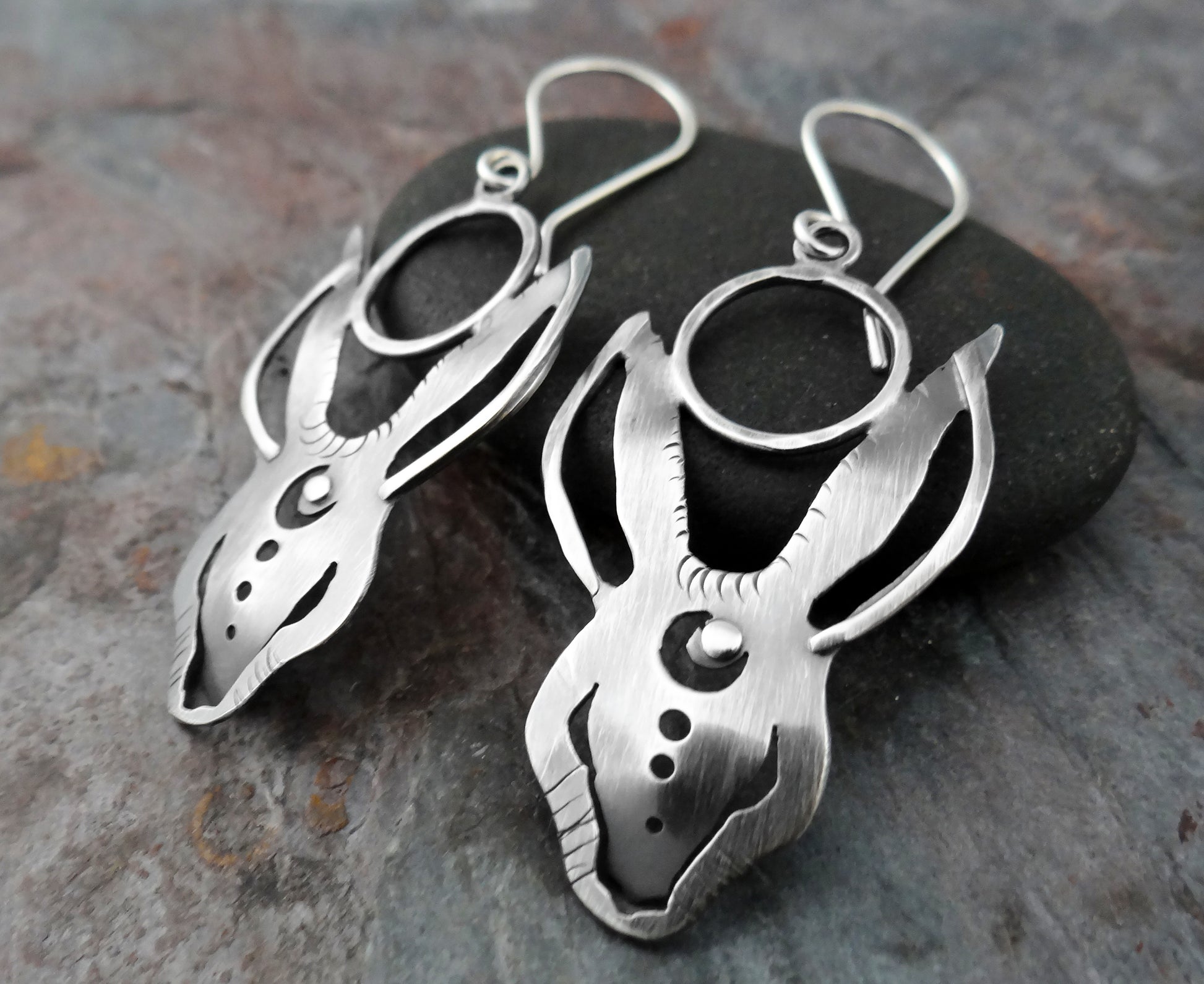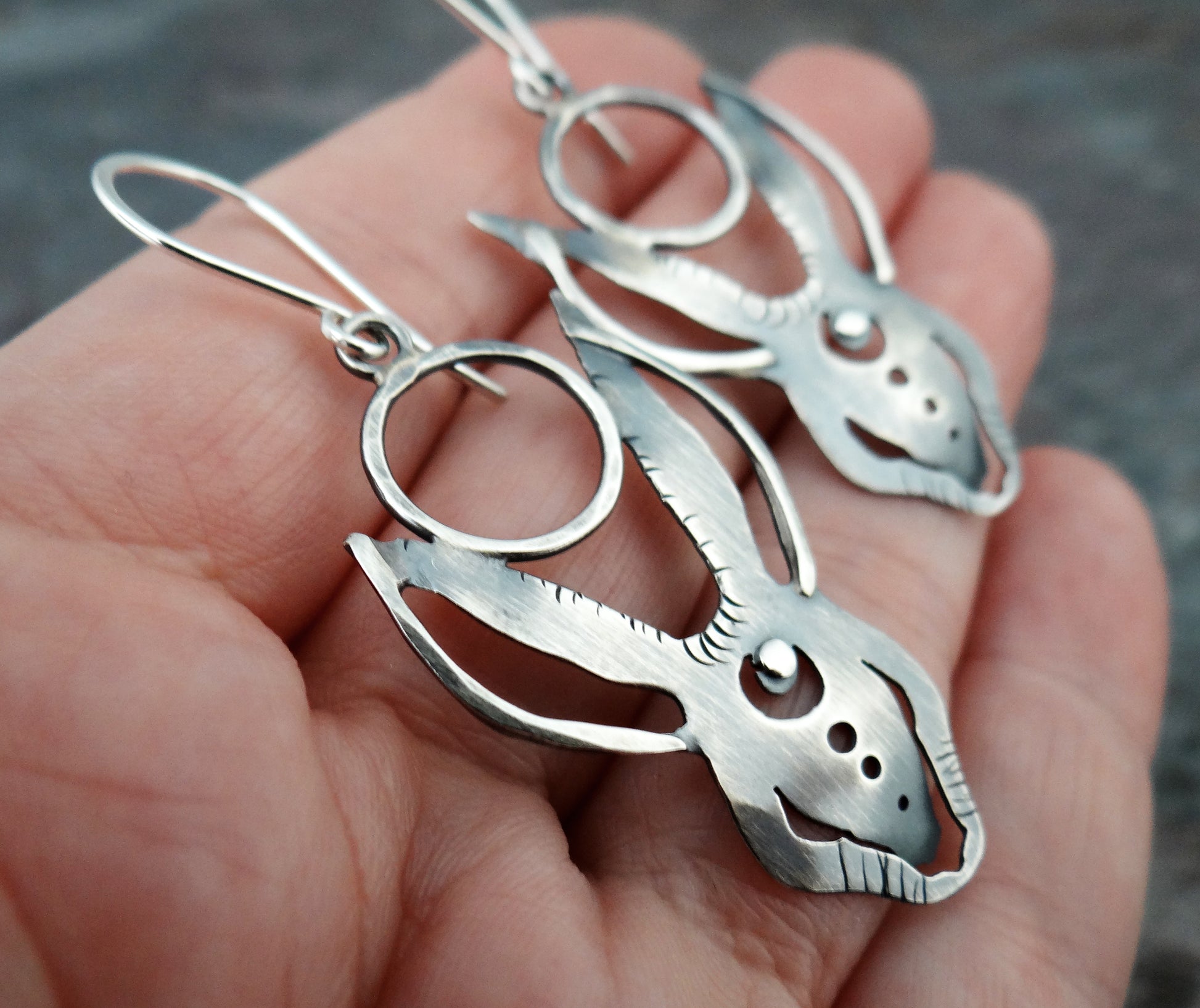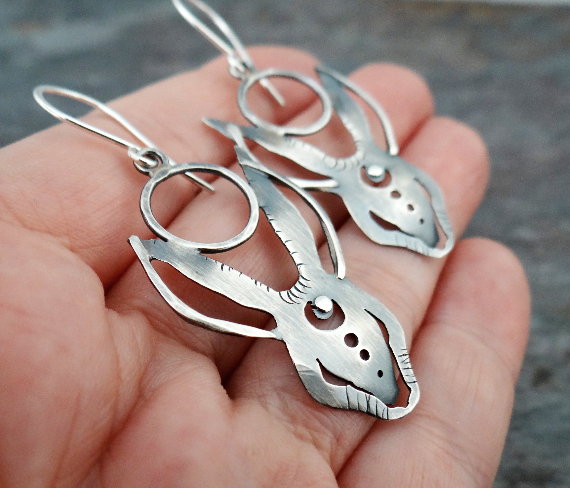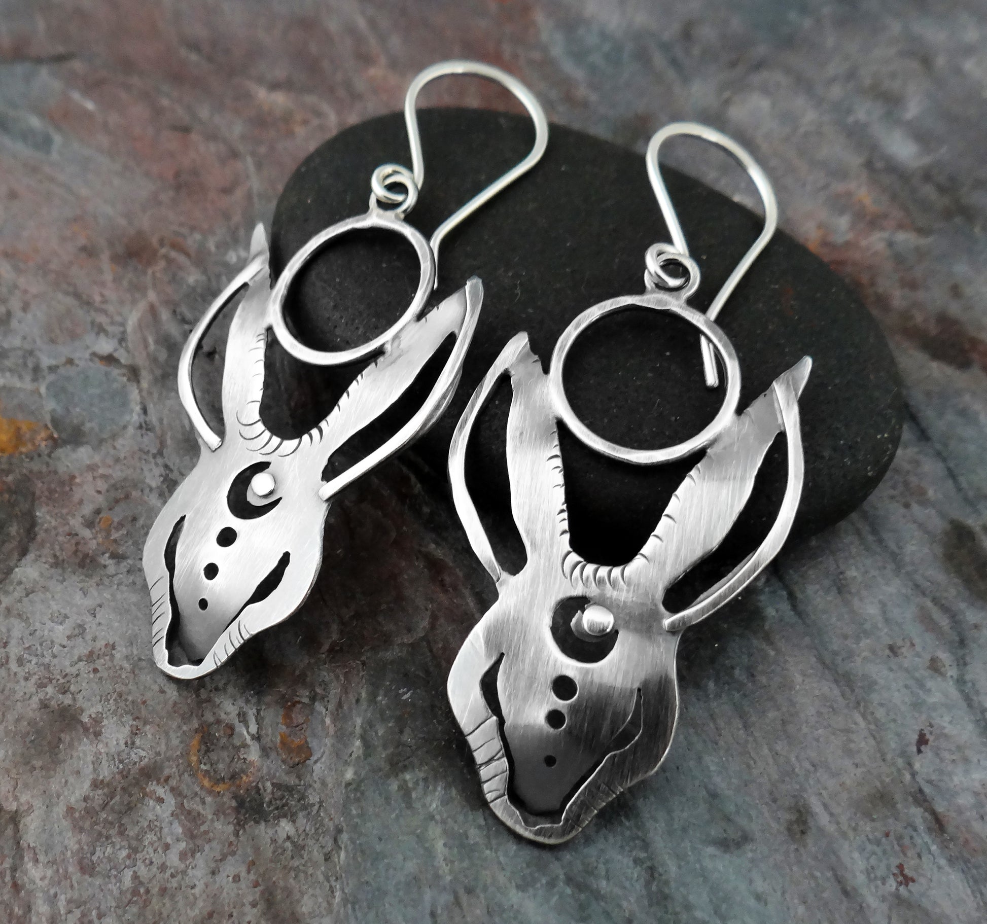 A rabbit hops in the moonlight. Completely hand-fabricated from solid sterling silver. Very lightweight and comfortable.