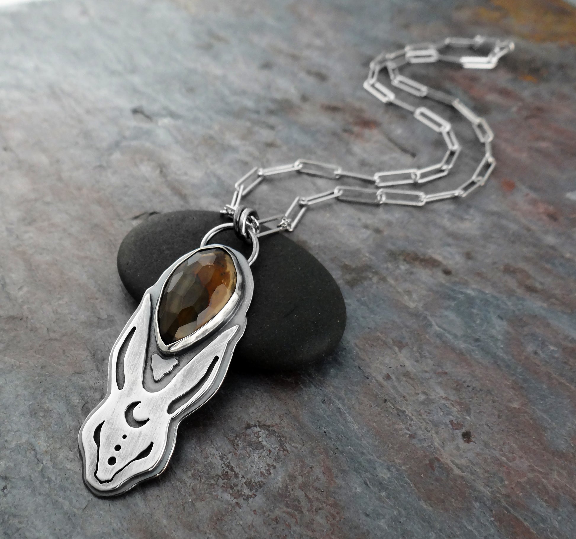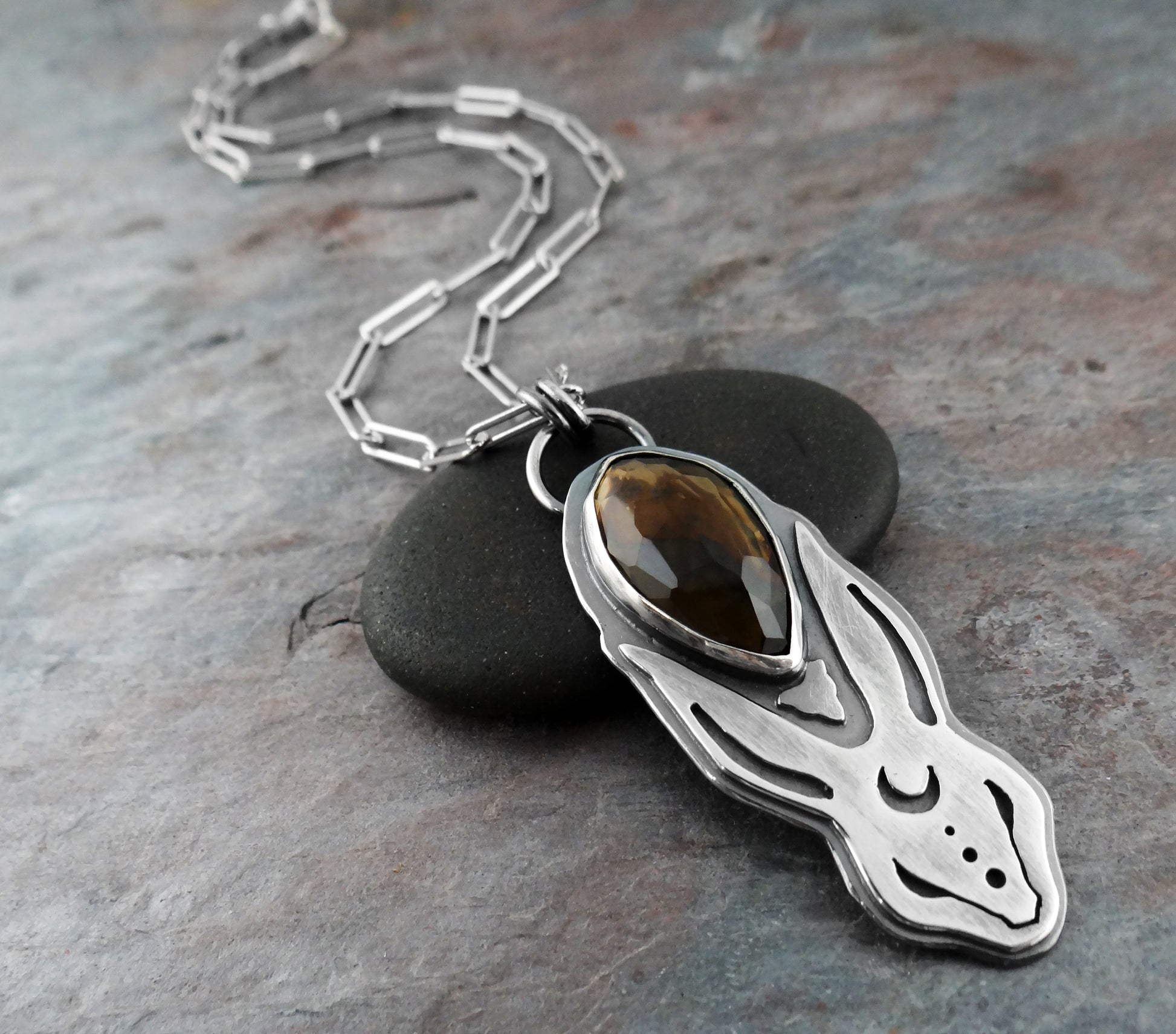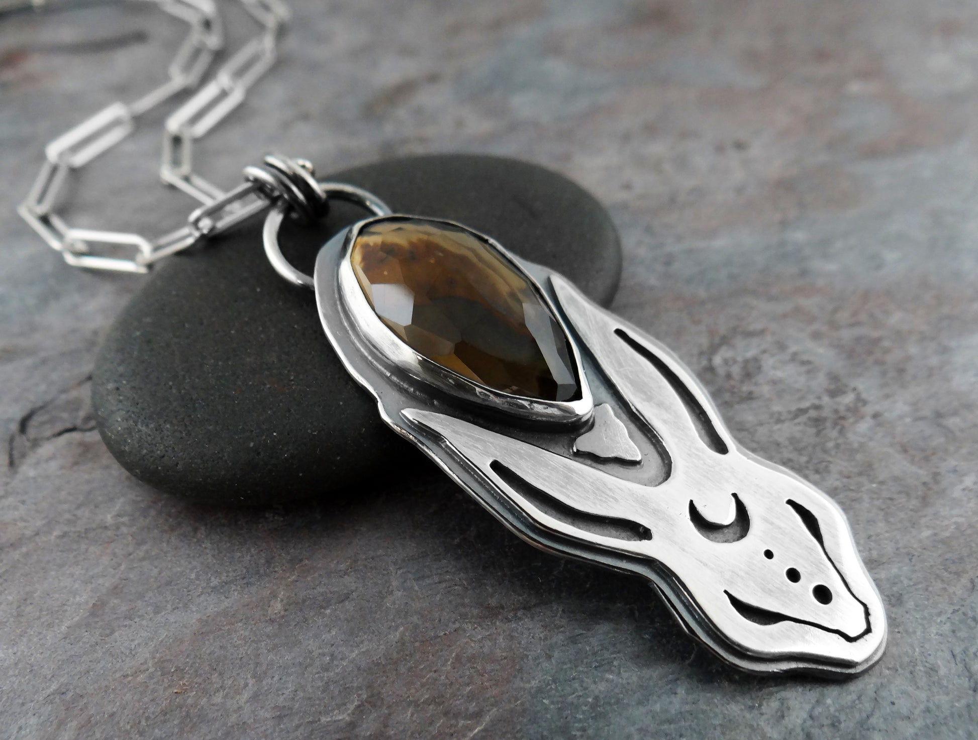 Completely hand-fabricated from solid sterling silver and faceted smoky quartz. The pendant is about 2-1/8" tall on a substantial weight 16" paperclip chain.