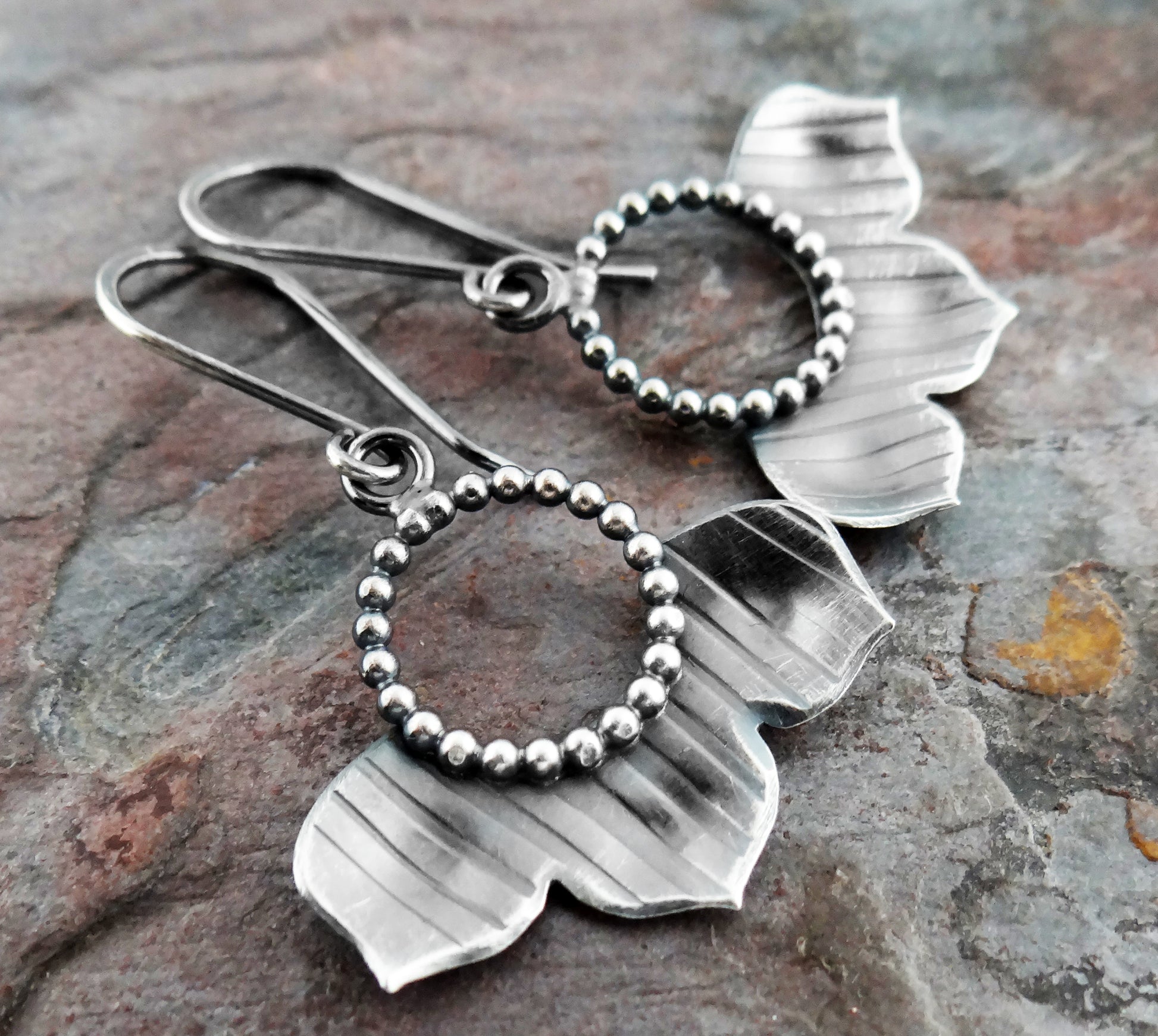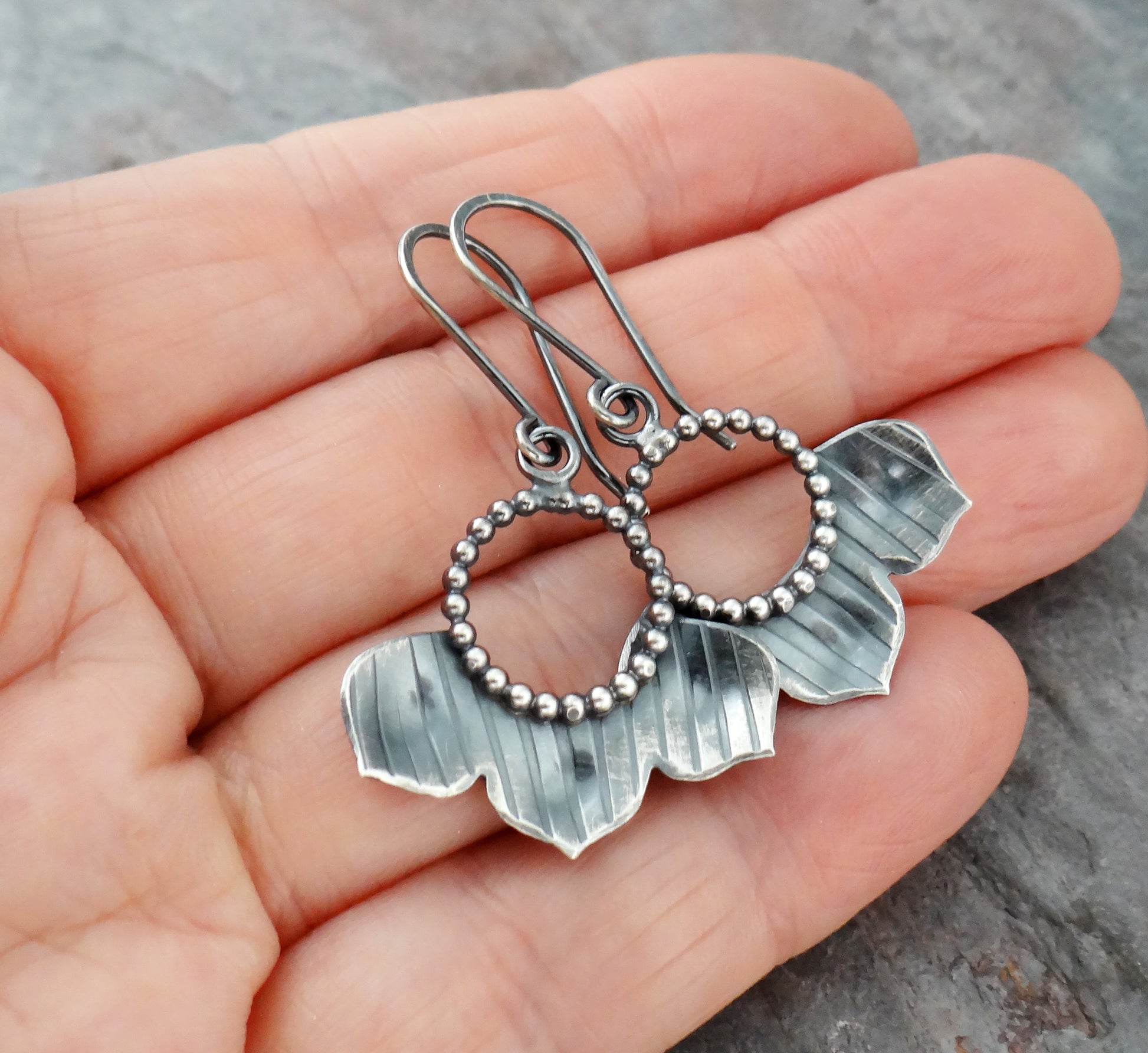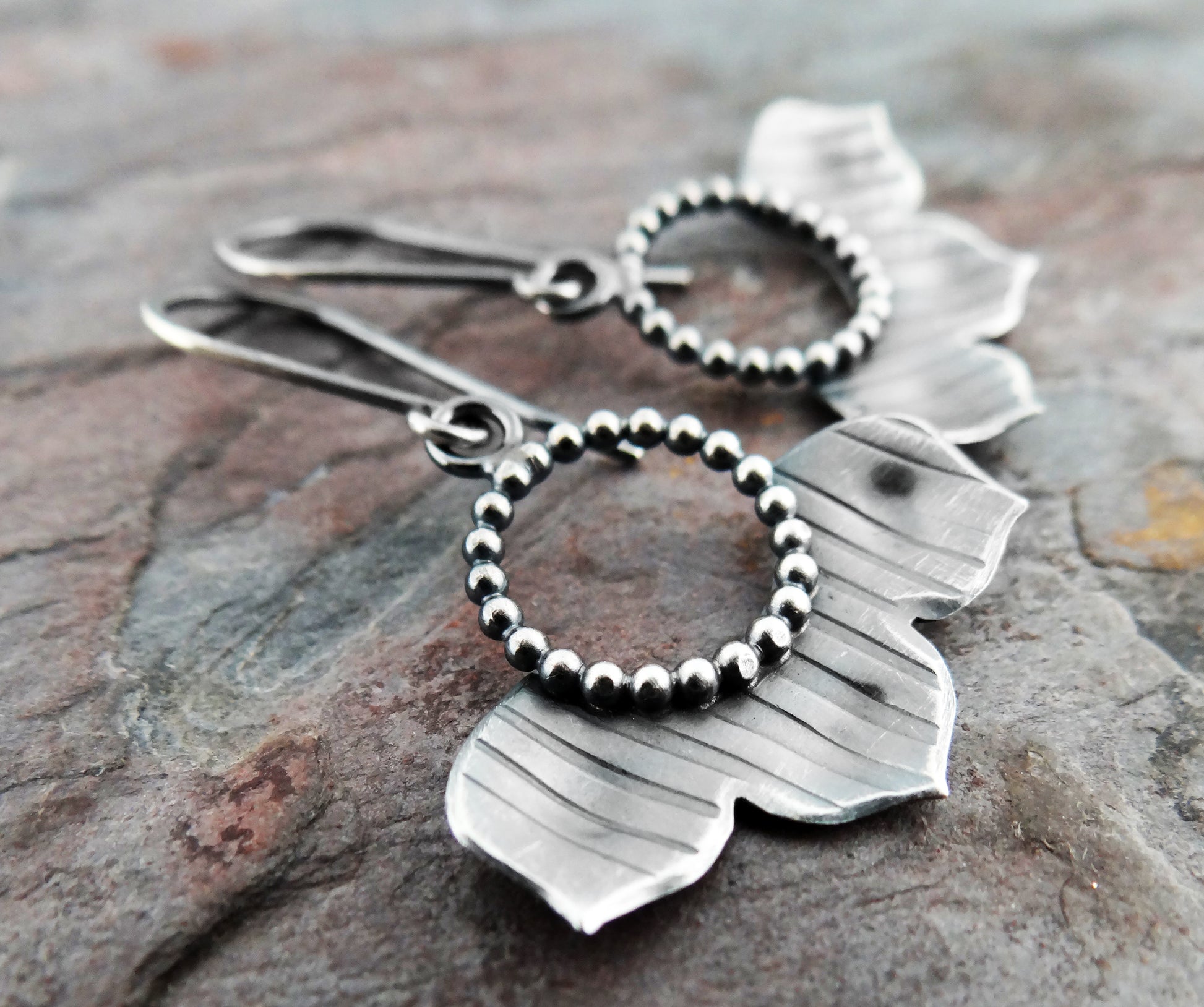 Flower dangle earrings. Hand fabricated from solid sterling silver with an oxidized and brushed finish. They are 1-1/2" long and 1" wide.
