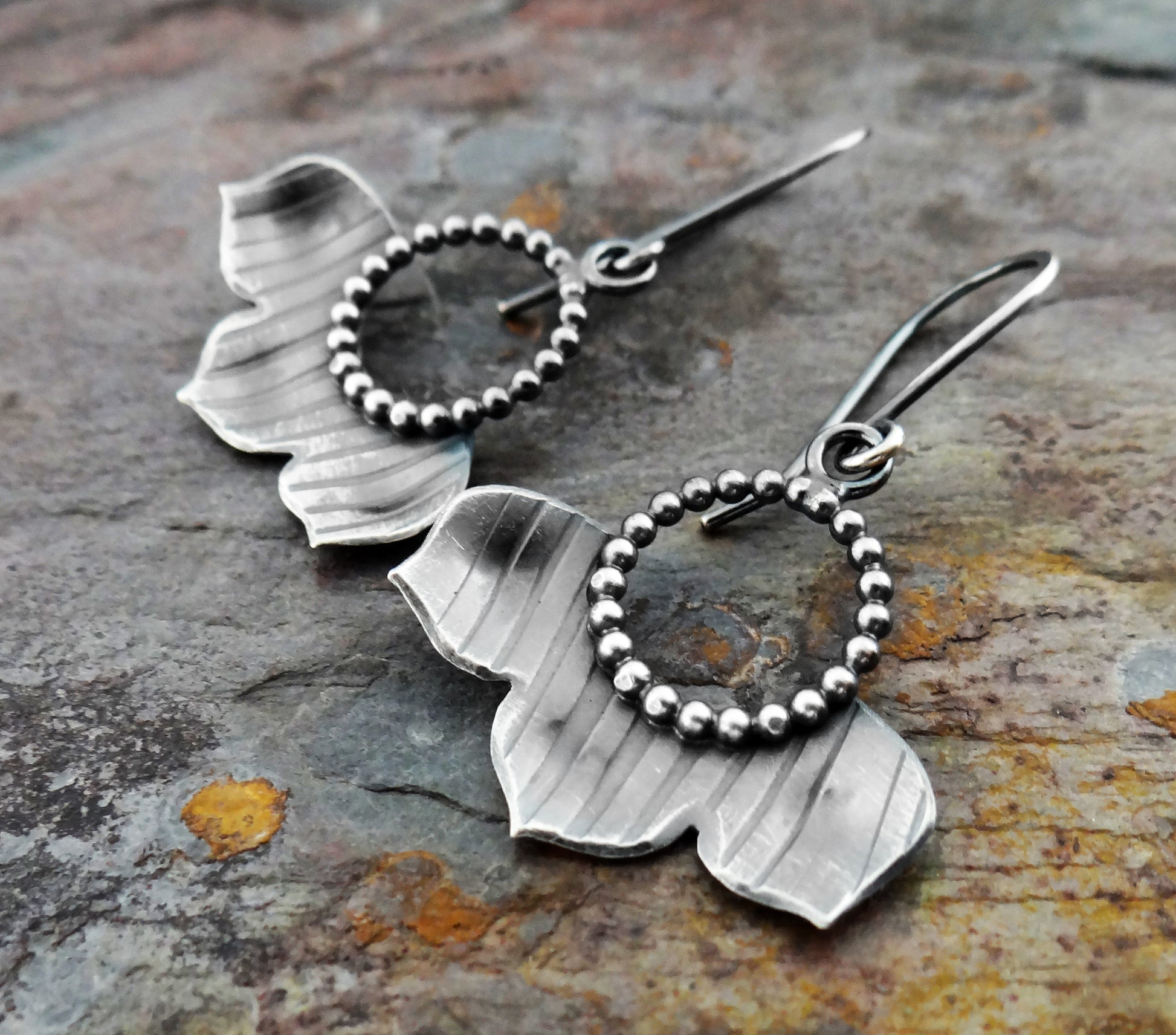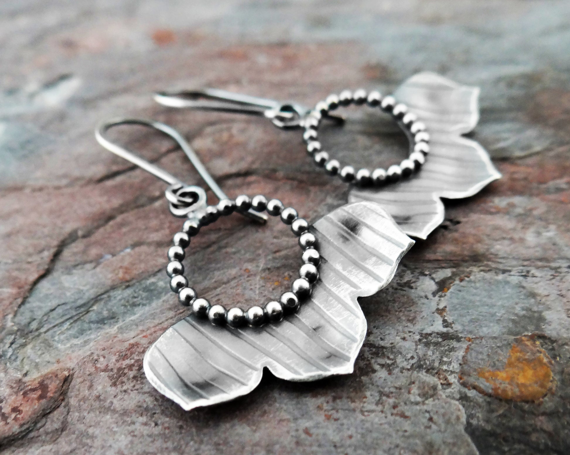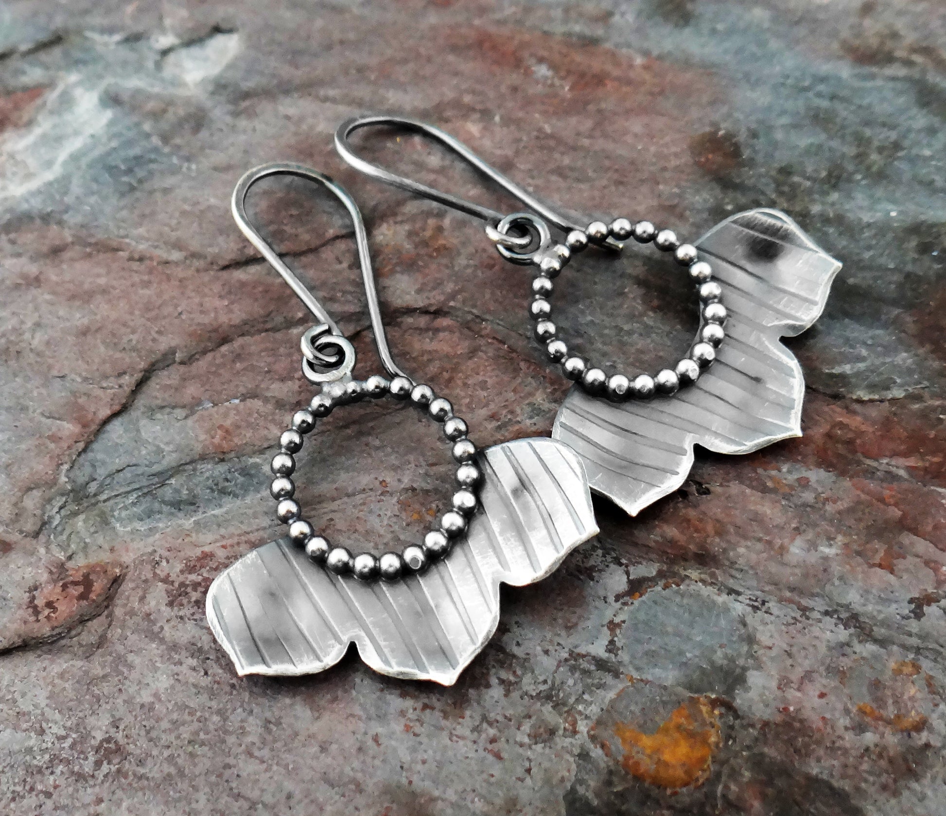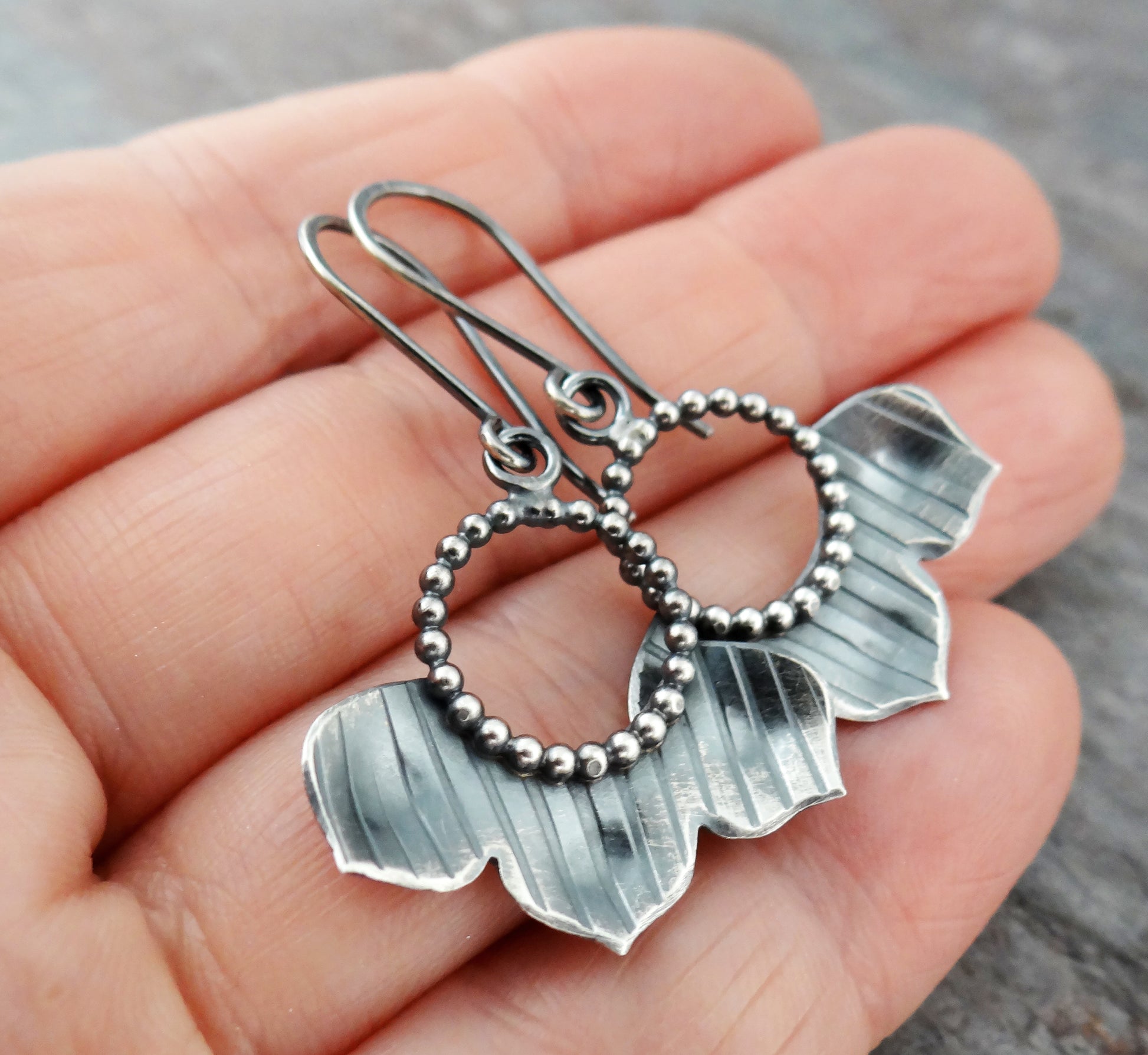 Flower dangle earrings. Hand fabricated from solid sterling silver with an oxidized and brushed finish. They are 1-1/2" long and 1" wide.